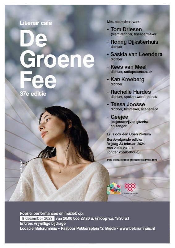 We nodigen je heel graag uit om op vrijdagavond 8 december om 20.00 u. naar De Groene Fee in het Belcrumhuis, Pastoor Pottersplein 12 in Breda, te komen. Met spetterende optredens van zeven dichters uit zowel Nederland als België en de liedjesschrijver, gitarist en zanger Geejee uit Breda. De entree is gratis, maar een vrijwillige bijdrage is zeer welkom. Er is ook een flink aantal scherp geprijsde dichtbundels te koop. Auto's mogen vanaf 20.00 u. gratis worden geparkeerd.