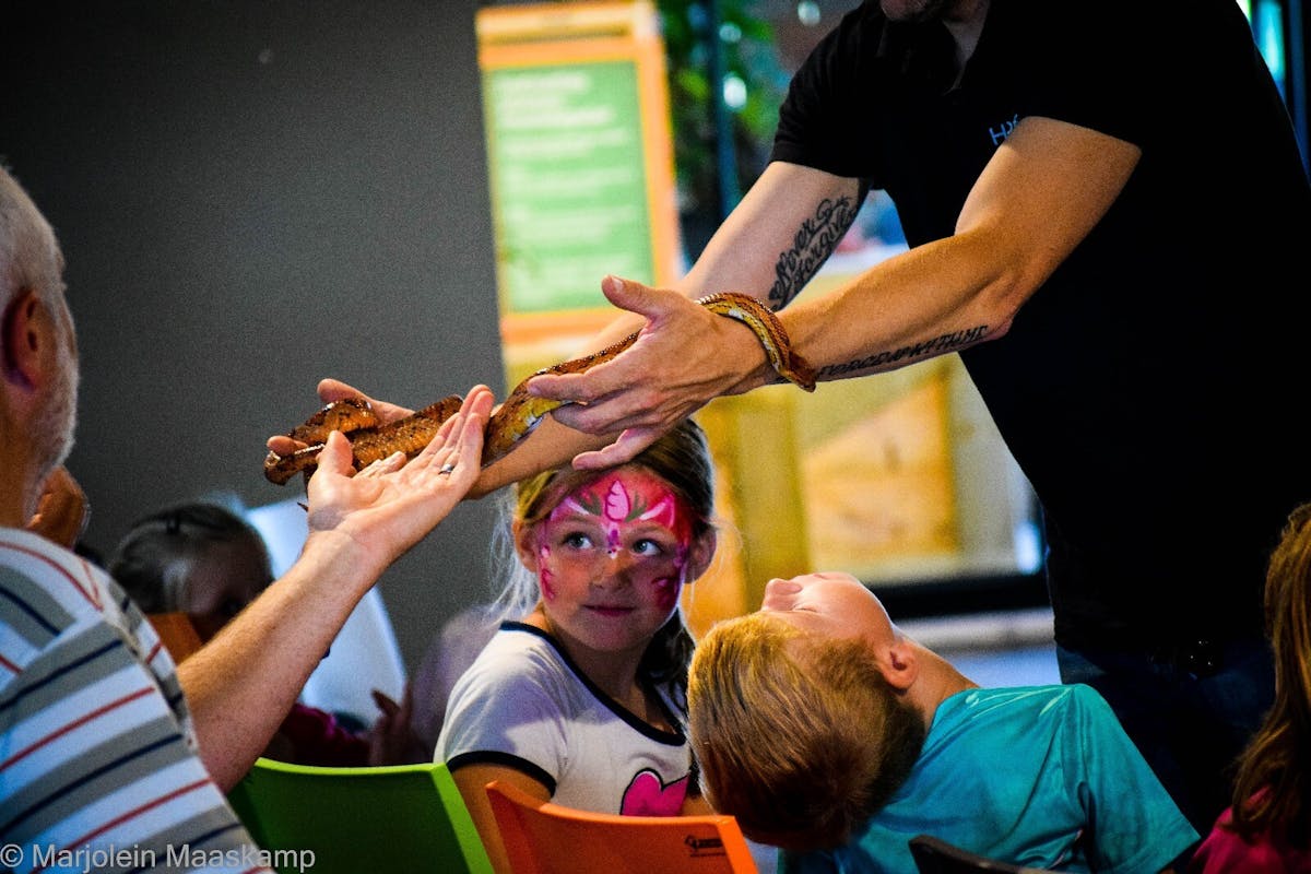15:30-16:00: Dierenpresentatie â Word een jonge bioloog! Leer kijken als een echte dierenonderzoeker. Ontdek hoe slangen leven, eten en bewegen.