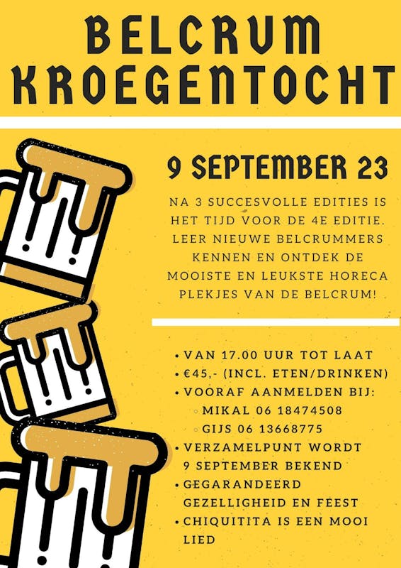 Zaterdag 9 september organiseren wij een kroegentocht in onze mooie wijk! Voor buurtgenoten die in deze wijk wonen. We laten je kennis maken met de mooiste parels van onze wijk, dus zorg voor dansschoenen, dorst, oppas voor de kinderen en we maken er een mooie avond van!
