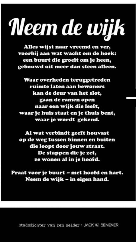 Vandaag is het Gedichtendag! Daarbij hoort natuurlijk een mooi gedicht over 'de Wijk'. Geschreven door de stadsdichter van Den Helder: Jack W. Beneker