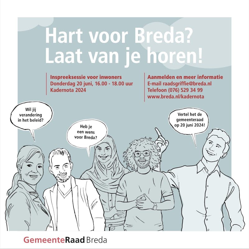 Als er nog vragen, op- of aanmerkingen zijn, horen we dat graag. Voor meer informatie en een uitgebreidere tijdlijn, kijk op www.breda.nl/kadernota
