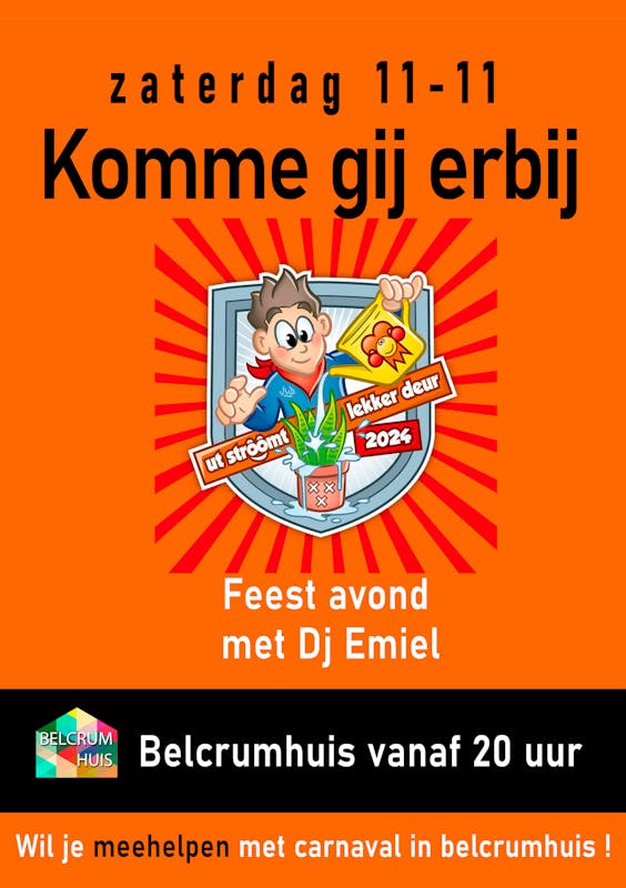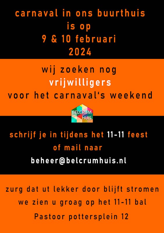 belcrumhuis zoekt een paar wijkbewoners die komend weekend 28/29 even een half uurtje willen helpen met het rondbrengen van flyers voor de 11-11 feest belcrumhuis.