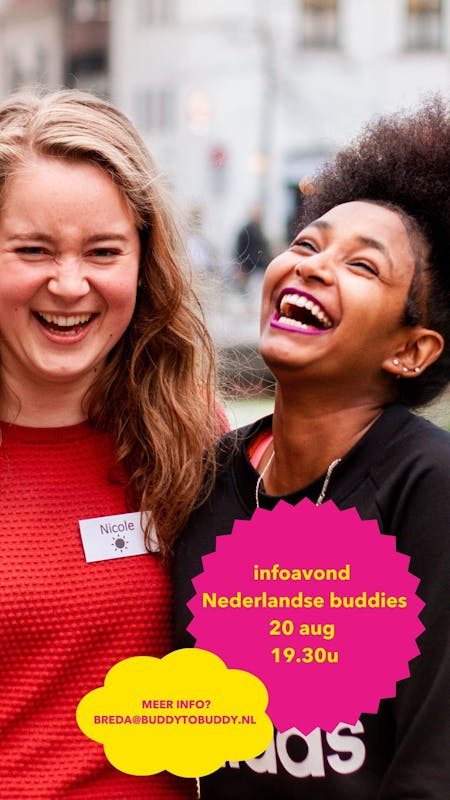 Ontmoeten we je op dinsdagavond 20 augustus om 19.30 in onze Huiskamer (Christiaan Huygensstraat 52, Breda)? Deze informatieavond is voor Nederlanders die graag buddy willen worden. Je bent van harte welkom om deze avond jezelf te komen informeren, vragen te stellen en andere Nederlanders te ontmoeten.