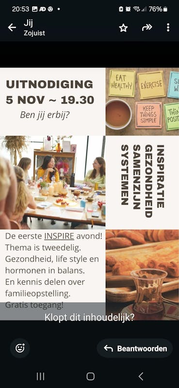 De eerste woensdag is het thema gezondheid, life style en darmen in balans. Dit wordt professioneel ondersteund door een voedingsprogramma waar steeds meer mensen heel veel baat bij hebben. Terug in balans, zelfs je hormonen.