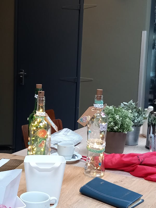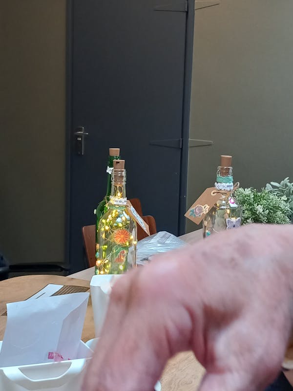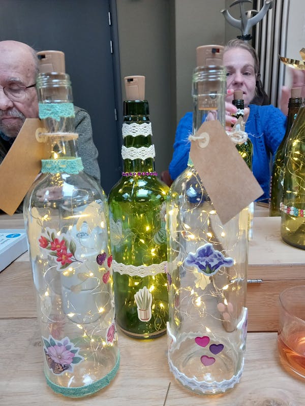 Er werden veel mooie flessen versierd met verlichting en plakkers.