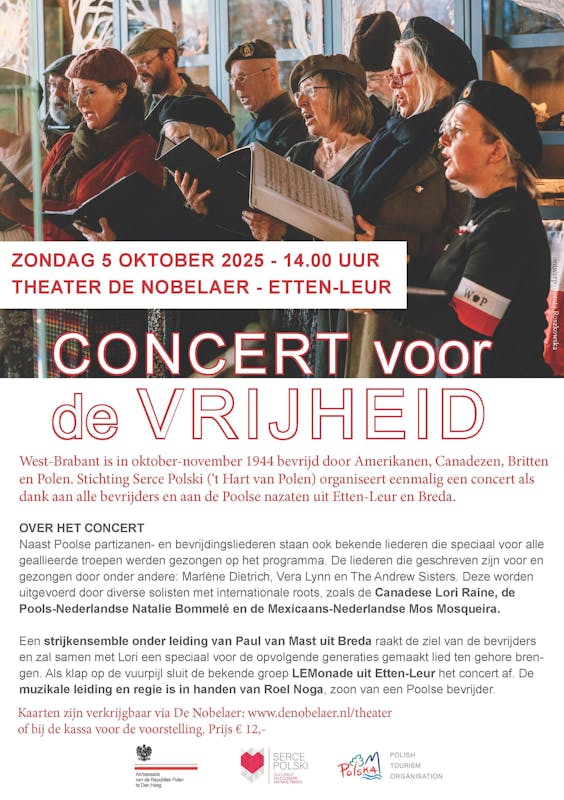Speciaal worden de dappere Poolse strijders onder de aandacht gebracht, die in tegenstelling tot de andere geallieerden, niet meer terug konden keren naar hun vaderland. Na de oorlog bleef Polen bezet onder de communisten; er was geen sprake van vrijheid. Tijdens het concert zullen Poolse Partizanenliederen en veldhymnen ten gehore worden gebracht, afgewisseld met liederen die ter ondersteuning van het gemoed van strijders dienden. Ook ondergrondse strijdliederen zowel vanuit de oorlog als tijdens de communistische periode krijgen aandacht.Onderdrukking en strijd zullen tenslotte uitmonden in een spetterend slotgedeelte waar de vrijheid vol gevierd zal worden. Speciaal voor dit concert is een muziekgroep samengesteld, bestaande uit ervaren Brabantse en Poolse zangers, solisten en muzikanten. De muzikale leiding is in handen van Roel Noga, Brabants musicus en zelf zoon van een Pools oud-strijder.